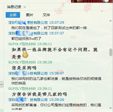 当前导热材料硅胶片市场一片红海,就电子产业集群地的广东深圳、东莞、江苏苏州、昆山等地,导热材料也是鱼龙混杂,大大小小几十多家厂商,其中很大一部份都是夫妻店,或者4-10名员工靠一台搅拌机,一台模切机的小作坊营生,没有研发团队,也没实验室,更没有可靠度数据,凭的是所谓的经验制造。有不少确实生产不了高品质导热硅胶片,索性干起虚写K值,乱填数据的皮包公司的营生,对外也同样号称是高导热硅胶片的生产厂家。因为GLPOLY经常收到同行的询价和议价,从材料本身成本核算基本上沒有做得到可能。比如,上周有个客户要找款3W左右的导热硅胶片,在国内同行中找了四家的样品来测试,都已经找到了5W的导热硅胶片了,可实测出来最高的才1.6W,面对如此复杂的市场环境,客户很无耐。后来他们经理在朋友的推荐下找到了我们公司,以下是与客户QQ对话的一个截图。