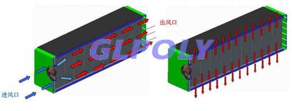 采用气体(空气)作为传热介质的主要优点有:结构简单,质量轻,有害气体产生时能有效通风,成本较低;不足之处在于:与电池壁面之间换热系数低,冷却速度慢,效率低。目前应用较多。